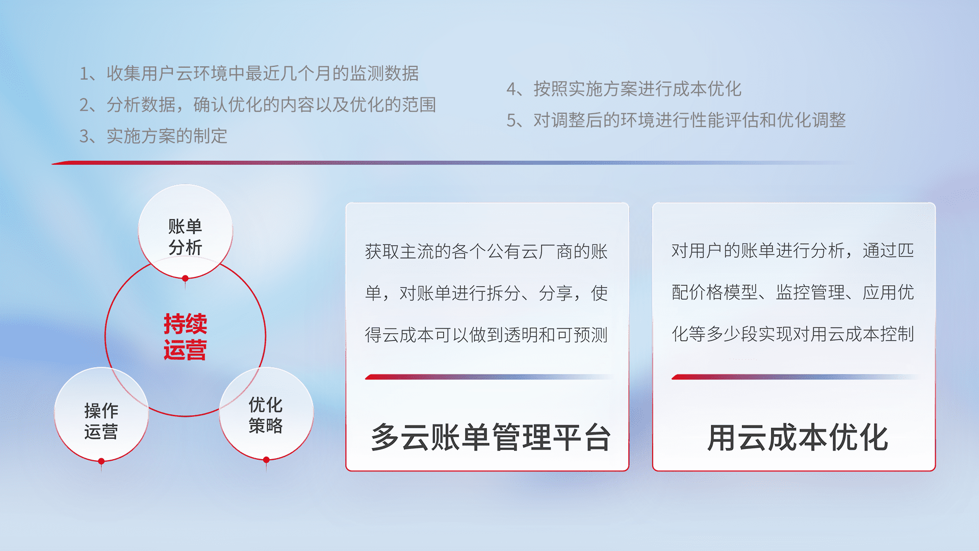 通过多云纳管,,,,以统一的资源数据模型把客户的云资源进行抽象和封装,,,进而实现对多云资源的统一操作,,,,保障云资源管理的可靠性、、稳定性与可用性。。量身定制化运维内容,,,配置、、、开发运维、、补丁管理、、备份、、、、监控、、、认证和访问管理、、审计和日常巡检等,,保障在用云过程中的可靠度,,,,稳定度以及高可用率。。。。